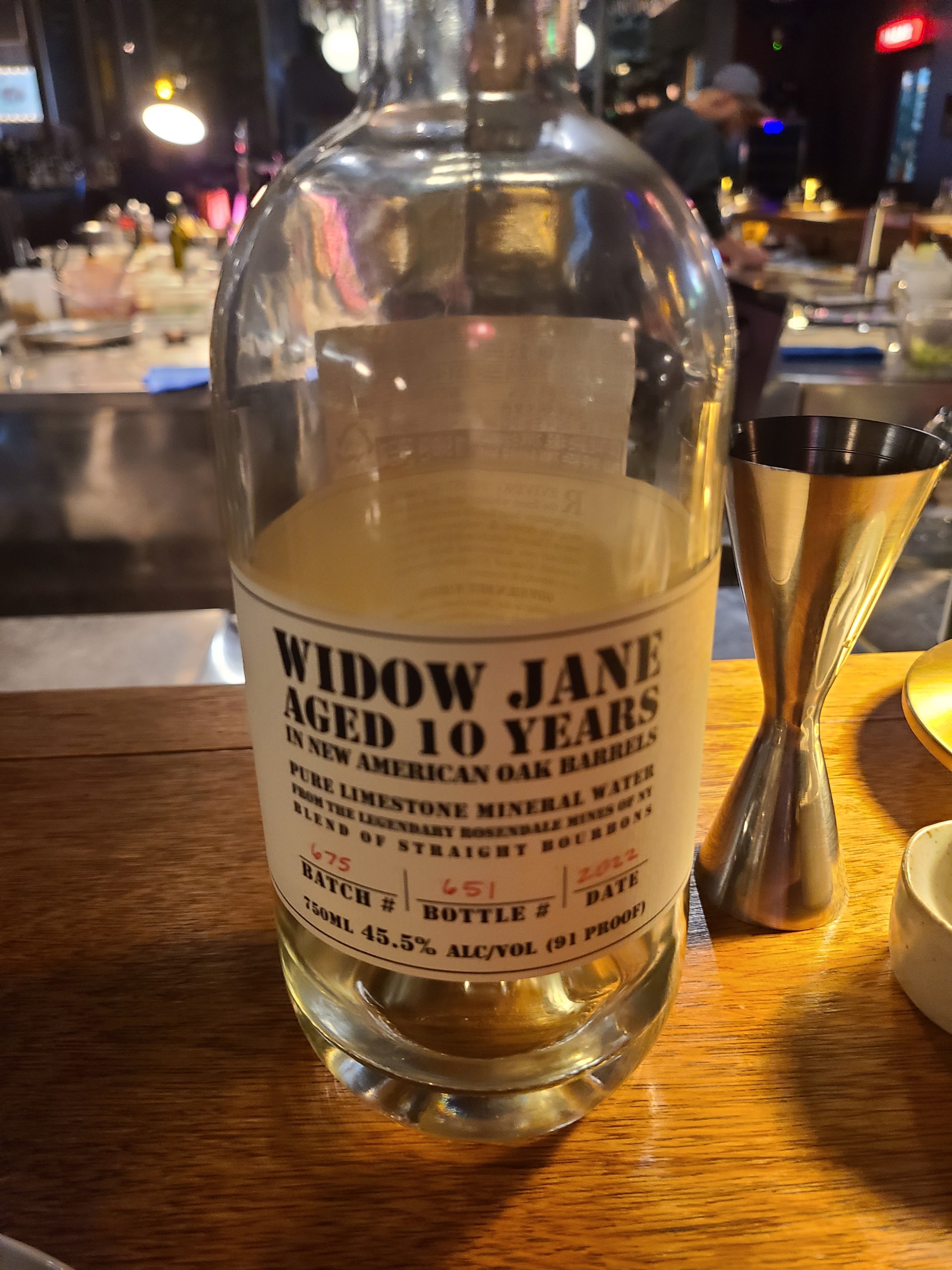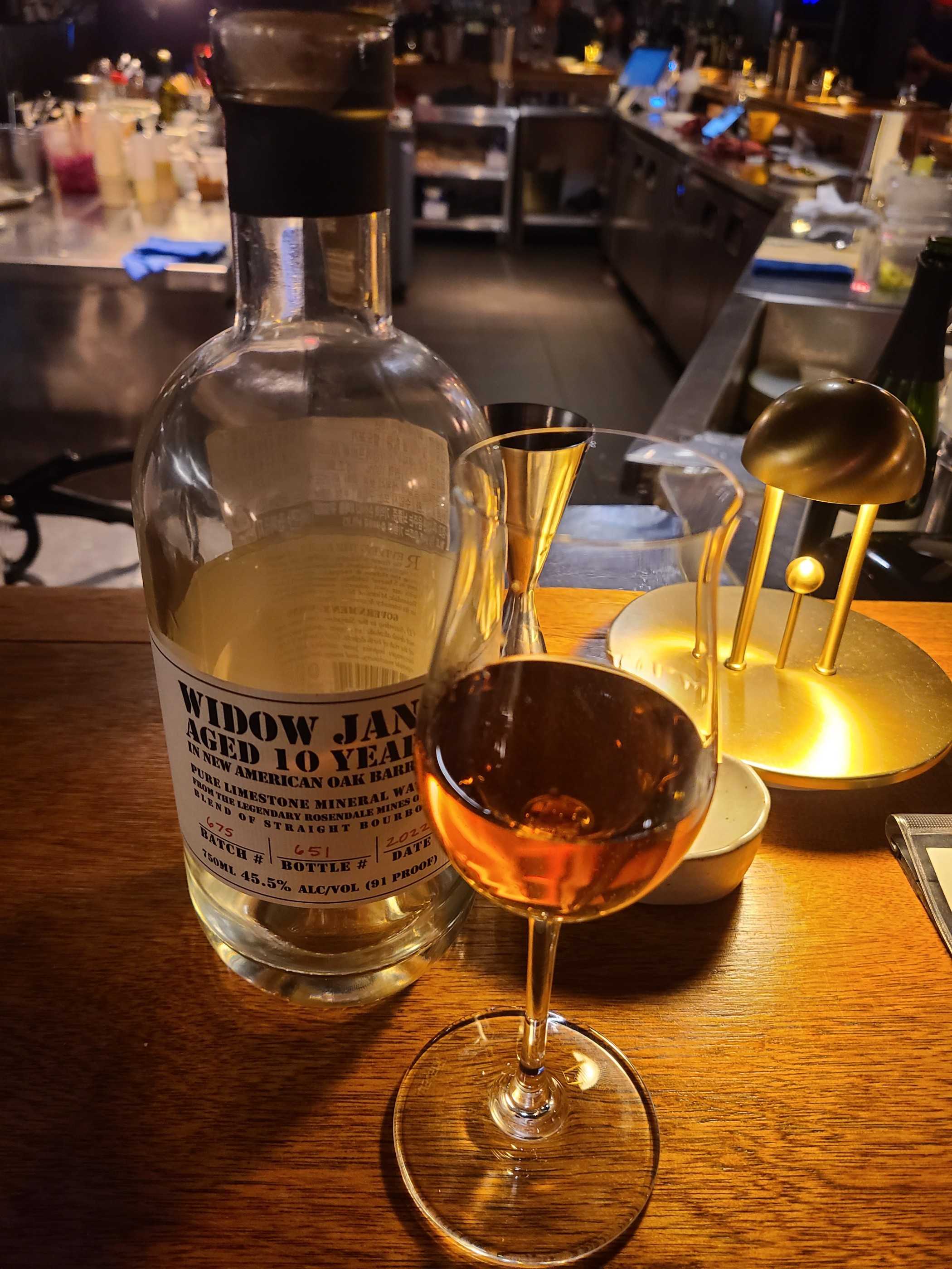 종류 : 버번 위스키 용량 : 750ml 도수 : 45.5% BATCH # 675 BOTTLE # 651 DATE # 2022 바틀 막 잔 위도우 제인 10 향 자체는 강하지 않다. 버번 치고는 꽤 연하다고 느낀다. 카라멜의 달달함과 고소한 너트가 올라온다. 우디함과 바닐라, 넛맥, 시나몬, 초콜릿의 단 향. 알콜이 치지 않아서 우아하고 부드럽게 느껴진다. 그리고 약간의 흑설탕과 시트러스 또한 함께 올라온다. 깔끔한 단 맛과 시트러스가 꽤 강조된다. 입안에 오래 머금어도 부드럽다. 스파이시는 부각되지 않고 향에서 느꼈던 다크 초콜릿이 있다. 피니쉬는 짧다. 이 위스키 처음과 끝은 초콜릿이다. 역시 좋아하는 버번이다. 도수가 높지 않아서 바디감이 살짝 아쉽다. 도수가 더 높았으면°°°!!!!