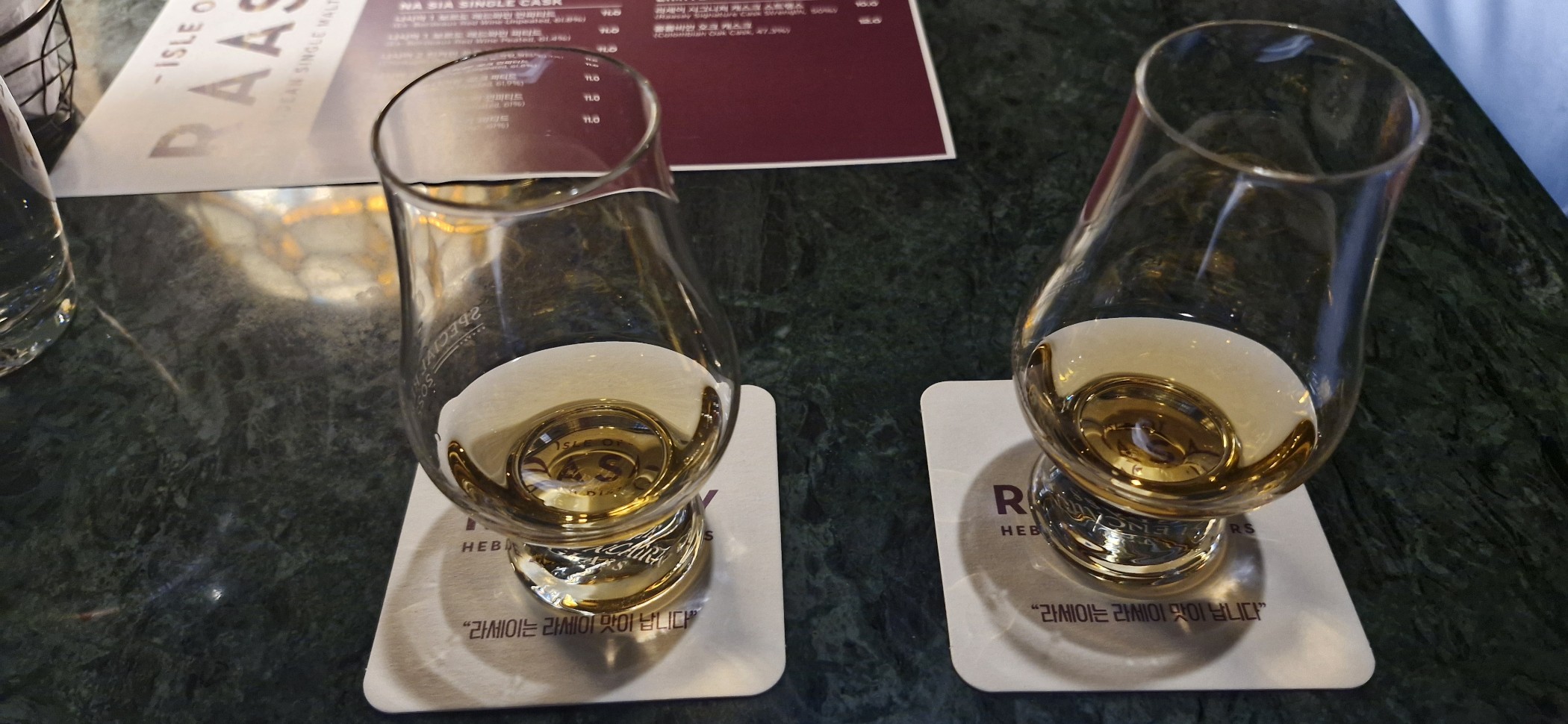 라세이 시그니처 cs 50% 사진 왼쪽 시그니처, 오른쪽 시그니처 cs n 피트(시그니처보다 강함), 라이, 바닐라 , 볶은참깨 p 바닐라, 피트, 소금, 꿀, 라이 , 민트 첫맛이 피트 빠르게 지나가고 강한 단맛이 탁치고 다시 피트가 올라오고 짰다가 단맛 설핏 느껴지다 라이와 민트 화함이 강하게 느껴짐. f 깨, 피트, 바닐라, 카라멜, 라이, 민트 고소함이 입안을 꽉채웠다가 피트가 자리잡고 쭉이어지면서 바닐라 캐러멜로 이어지는 단맛과 어우러짐. 이후 라이 맛이 치고 올라오고 화한 민트로 변함. 총평 알콜도수차이가 생각보다 크지않아서 얼마나 차이가 날까 궁금했는데 시그니처와 유의미한 맛과 향의 강도 차이가 있다. 부정적인 맛은 잘 안느껴지지만 긍정적인 맛은 증폭됨