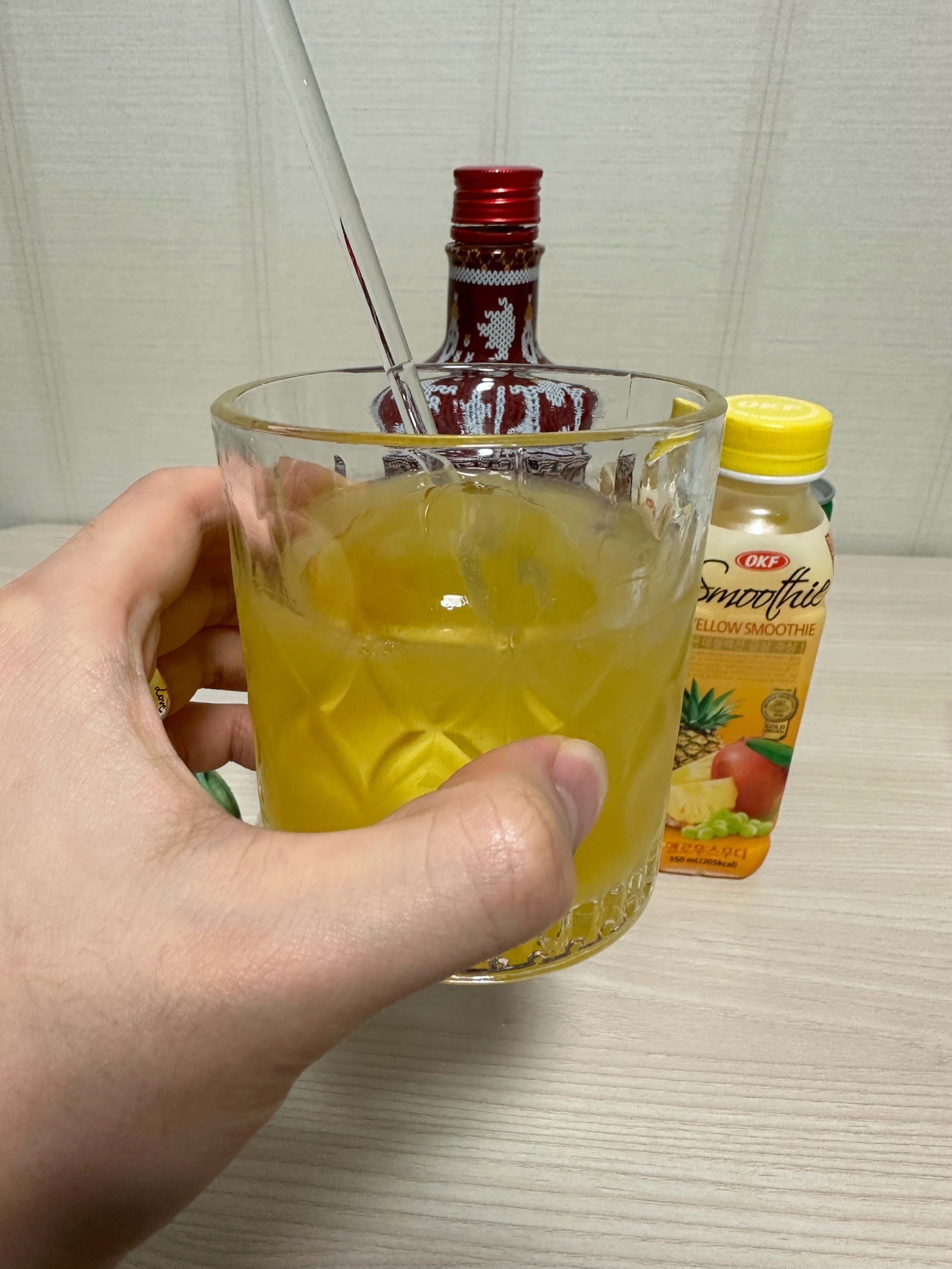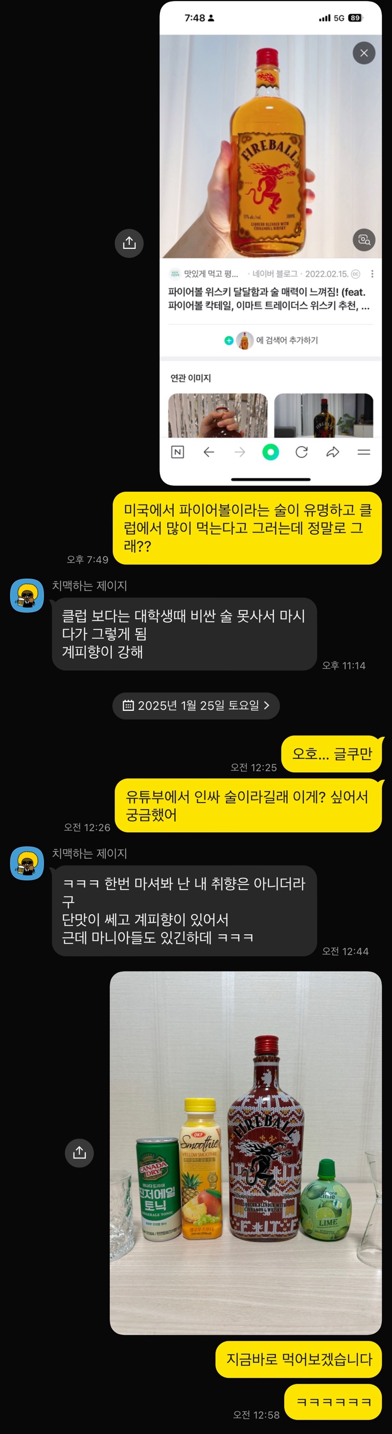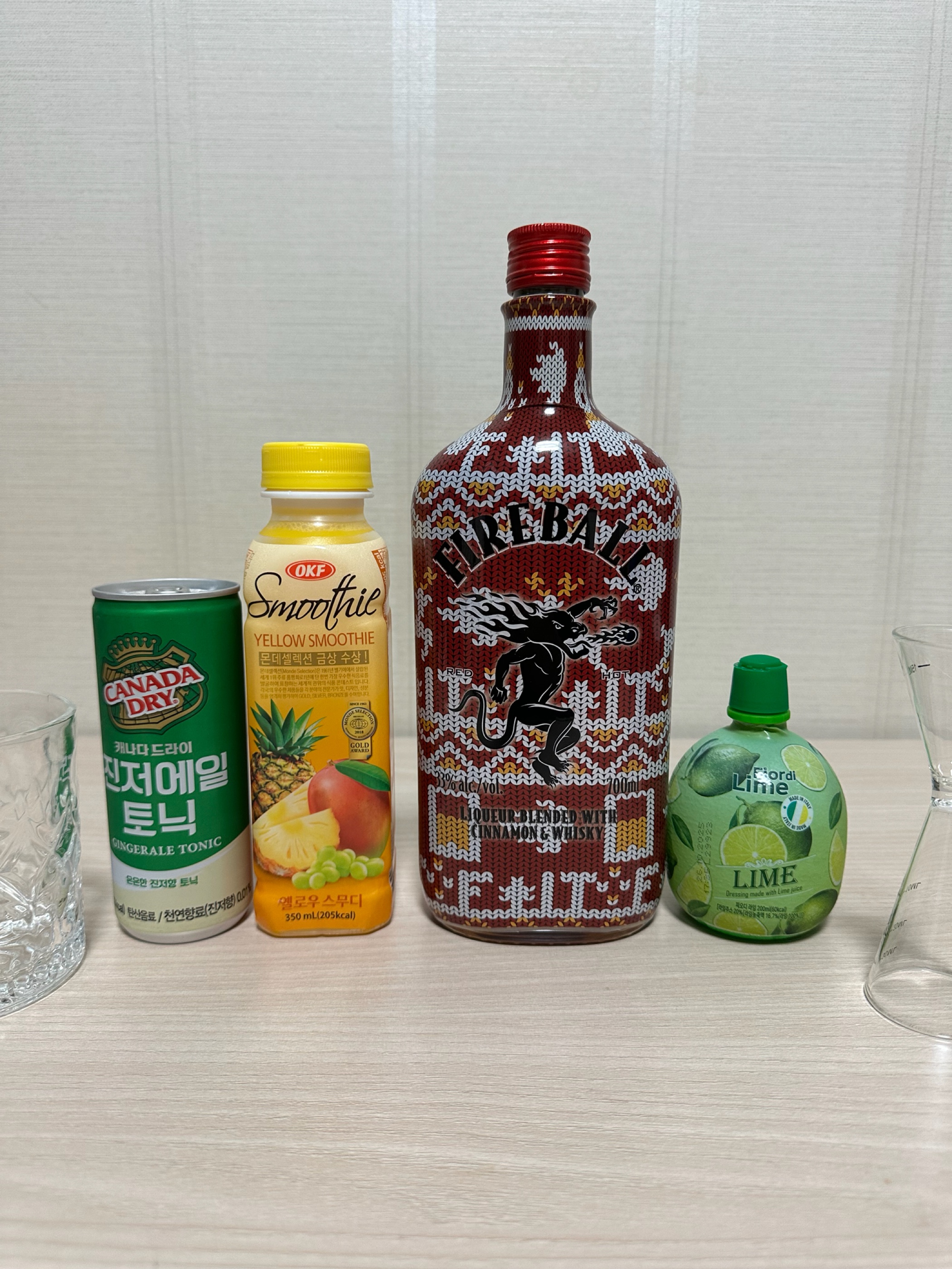 명절이 다가오니 캐나다에서 만든 미국 인싸 술(?) 인데 수정과 향이나는 오묘한 리큐르를 준비했습니다. 미국 사는 사촌형들께 여쭤보니 인싸 술까진 아니고 대학생들 돈 없어서 마시거나 파티용 술이라고 하네요;; 향 : 계피, 민트, 살짝 꽃내음, 솔직히 말해서 명절에 큰집에서 식후음료로 꺼내준 잣 띄운 수정과 향 맛 : 살짝 오렌지가 있고 계피향이 너무 강해서 단맛 외에는 느껴지지 않음 🥃파이어볼 뮬 레시피🥃 파이어볼 30ml 진저비어 120ml 라임즙 10ml 파인애플 주스 10ml 가니쉬로 라임슬라이스 위스키라 쓰여있긴 한데 한국에서는 리큐르로 분류됩니다. 파이어볼 뮬의 맛은 계피와 라임이 진하게 올라오면서 단맛이 다채롭고 밀도 있게 느껴집니다. 파인애플과 시나몬이 훅 올라오는데 계피를 사랑하는 저는 정말 좋아합니다. 살짝 생강이 느껴지며 수정과에 파인애플 넣은 것 같은 느낌입니다.