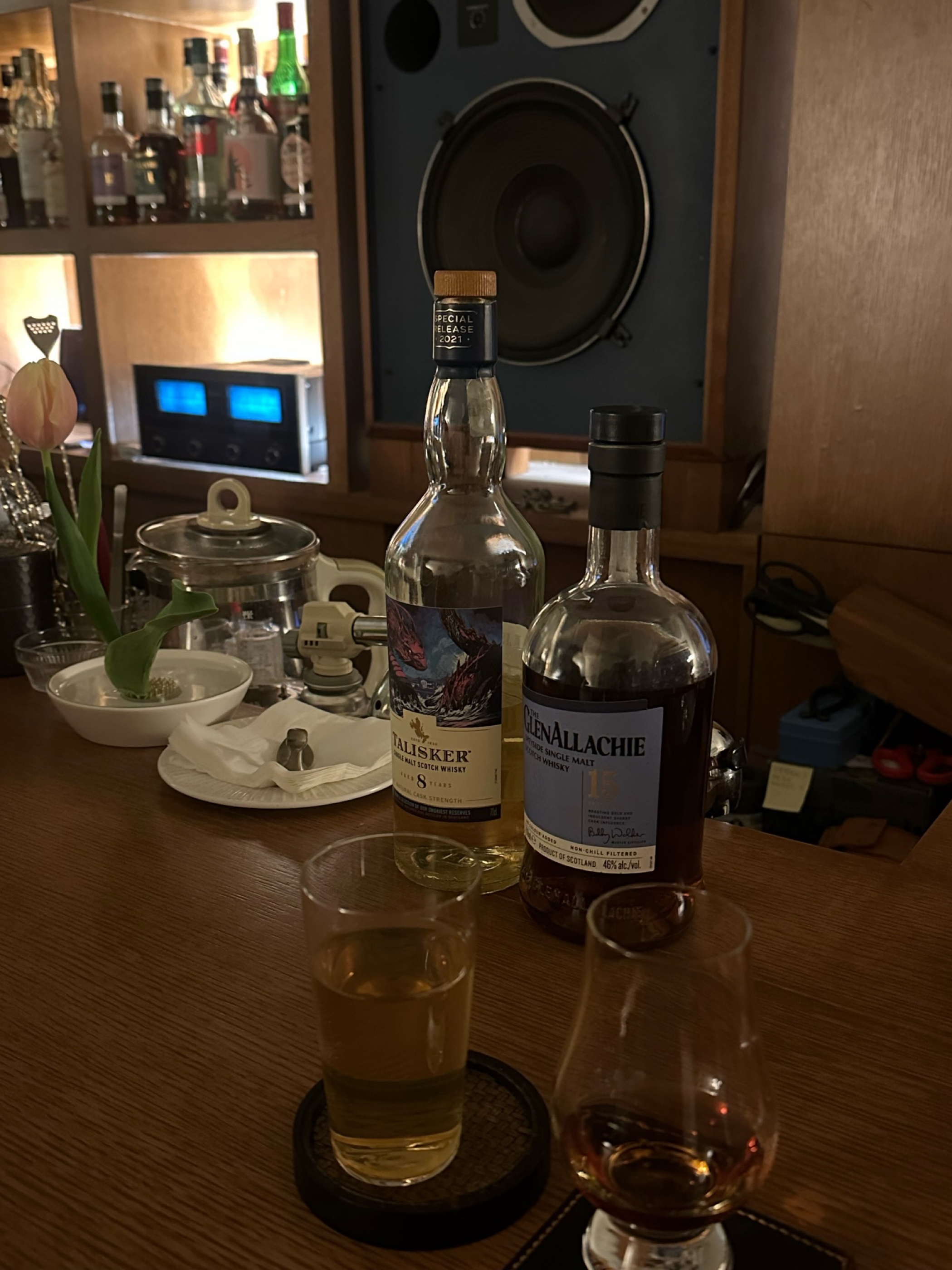 셰리 위스키 추천을 부탁드리니 글렌알라키 15를 주셨습니다. Leg : 꽤나 오래 남아있고 굉장히 진함 Nose : 체리와 무화과, 계피와 헤이즐넛이 느껴지고 개인적으로 닥터페퍼와 비슷한 향이 남 Palate : 하이랜트 파크에서 느꼈던 꿀의 맛과 비슷하고(헤더?), 오렌지 껍질의 풍미, 진한 다크초콜릿, 체리, 말린 과일 Finish : 달고 녹진한 체리와 초콜릿이 남고 흑설탕같은 씁씁하면서 달달함이 오랫동안 느껴짐 검은색 그 중에서도 타는 듯한 검정이 아닌 진득한 검붉은색이 떠오르는 맛입니다. 셰리 중에서 꽤나 괜찮은 맛입니다. 위린이인 저도 다르다는 걸 느낄 정도로 기억 속 구형과의 차이가 좀 있어서 취향에 따라 마셔보는 것이 좋을 것 같습니다.