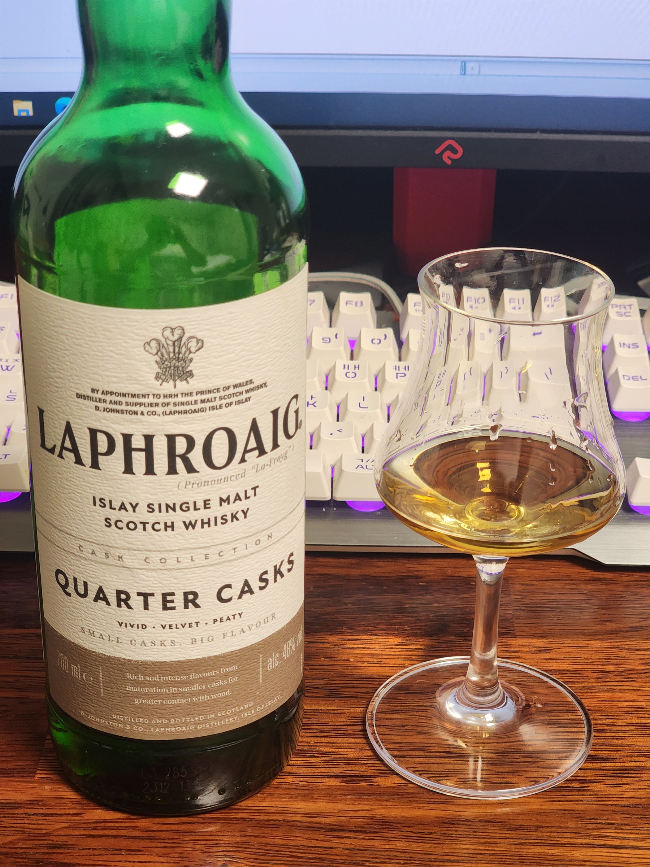 Aroma 건과실, 매실, 약피트, 짠내음 Taste 짠내음, 피트, 바닐라, 구운바나나, 허브 Finish 카라멜, 스모키 첫 향에서는 은은한 피트와 건과실의 녹진하게 달달한 향이 들어온다. 건무화과나, 매실같은 뉘앙스와 끝에 짠내음이 은은하게 느껴지며 향에서부터 바디감이 있겠구나 라는 생각이 든다. 맛에서는 입에 들어오자마자 은은한 짠맛과, 피트향이 지나가고, 무거운 향의 바닐라와 구운바나나의 느낌이 퍼지며 목을 넘어가기 직전엔 무거운 뉘앙스의 허브향이 느껴진다. 짠맛 때문인지 기분 좋은 바디감이 느껴진다. 목을 넘어가고 나면 카라멜의 향이 은은하게 깔리다가, 스모키한 장작의 향이 길게 느껴진다. 라프로익10을 바이알로 먹어봤을 땐 평범하다 했는데 쿼터캐스크는 바디감과 진한 달달함이 느껴지고 피트가 튀지 않게 잘 감싸고 있어서 밸런스도 너무 좋다. 사야할 위스키를 또 하나 찾았다.
