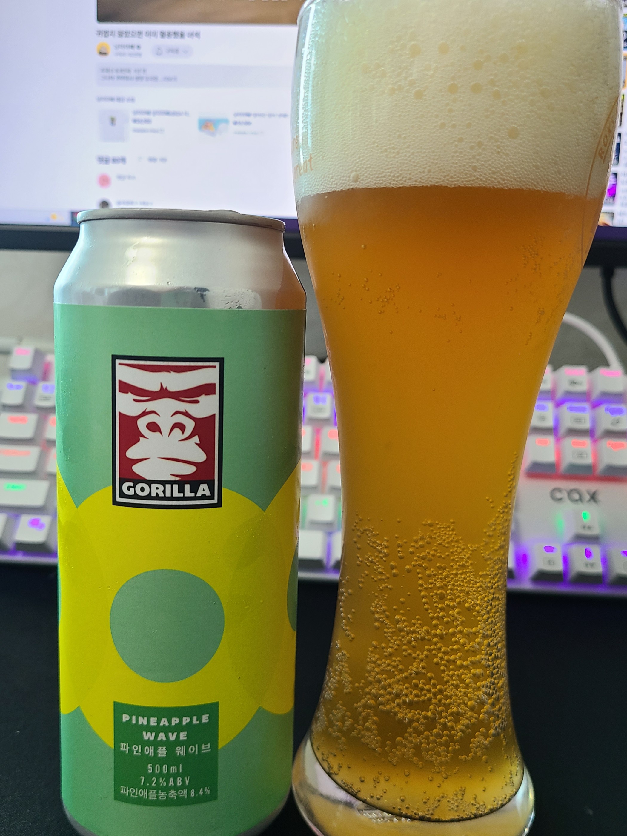 고릴라 파인애플 웨이브 도수 : 7.2% 맥주 몸에 안 받음! 맥주 잘 모름!이 쓰는 리뷰. 파인애플, 오렌지 혹은 라임의 신맛. 중간에서 느껴지는 약간의 짠 맛과 바질의 쌉싸름. 열대 과일류의 단 맛이 연하게 있고 사과 주스 맛도 끝에서 난다. 고소함도 있지만 새콤한 맛에 많이 죽는다 도수에 비해서 약콜이 막 강하지가 않다. 전체적으로 단조롭다. 딱 생각한 맛 그대로? 001