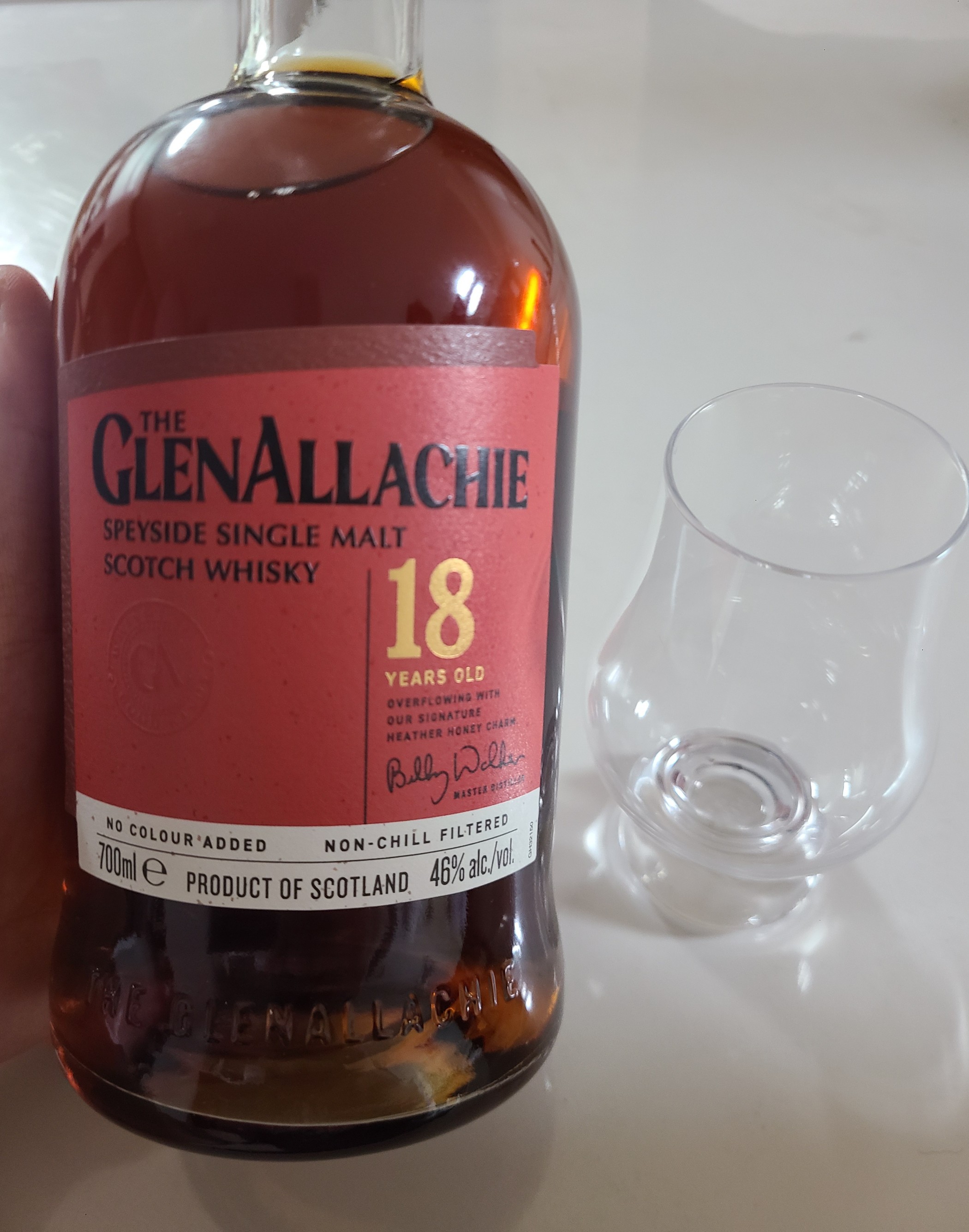 종류 : 싱글몰트 위스키 용량 : 700ml 도수 : 46% 뚜따 직후란걸 알고 읽어주세요. N - 오크, 건포도, 초콜릿, 푸룬, 바닐라, 꿀 일단 향이 복합적이다. 가장 보편적인 알라키 15랑 비교했을 때, 셰리는 줄어들고 오크, 과일, 초콜릿이 올라온다. 물론 건포도의 셰리가 있긴한데, 향이 안 풀려서인지 밑에 있다. (이건 시간이 해결해 줄 것) 화사하고 달달한 감이 꽤 있다. 부즈는 거의 없는데, 막 치고 올라오는 향이 없다. 오크와 푸룬 비슷한 과일 향을 중심으로 바닐라, 오렌지, 꿀이 주위에 있다. 전반적으로 과일들이 많이 있는데, 아직 자세히 찾기 어렵다. 15년의 상위 호완인지는 모르겠지만, 비슷한 결의 다른 술이다. P - 초콜릿, 오크, 계피, 셰리, 볶은 곡물 살짝 계피의 매운감이 있다. 다크 초콜릿과 오크가 강하게 느껴진다. 쌉싸름이 꽤 강조된다. 과일은 건포도만 느껴진다. (과일은 어디간거지) 바닐라의 뉘앙스는 있는데, 너무 연하다. 끝에서 볶은 곡물 같은 고소함과 오렌지의 시트러스가 느껴진다. F - 다크 초콜릿, 과일, 건포도 찐한 다크 초콜릿에 과일 칩이 살짝 박힌 느낌. 방금 뚜따한거라 그런지 꽤 아쉽다. 다크 초콜릿을 워낙 좋아해서 싫지는 않은데, 가격 보면 흠...