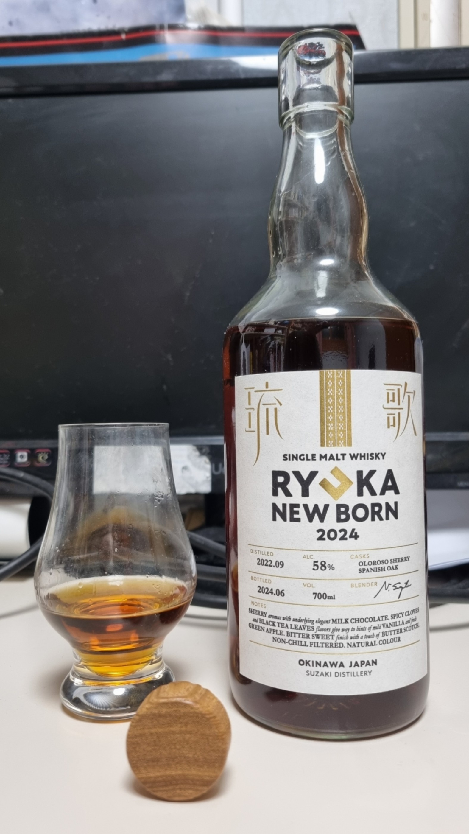 N.P.F.는 다음과 같음. N: 알콜취 4, 포도껍질 3, 파인애플 3, 양조간장 2, 밀크초콜릿2 P: 알콜 4, 플라스틱 4, 포도사탕 3, 파인애플 3, 고랑주 2 F: 파인애플 4, 포도껍질 2, 밀크 초콜릿 2 1~5까지 클 수 록 지배적인 편. 향에서는 농향 고량주류의 알콜취가 지배적인 편. 허나, 개봉 후 좀 내버려두면 톡 쏘는 듯한 향미는 좀 사그라든다. 그리고 살짝 간장류의 뉘앙스가 은은히 퍼지면서 나는 달콤한 포도껍질향.그리고 살짝 미미하게 밀크 초콜릿류의 뉘앙스가 난다. 첫 모금에선 농향 고량주?류의 알콜 타격감과 함께 연한 플라스틱?향과 미미하게 느껴지는 포도사탕 향미 입에 머금고 있으면 톡톡 튀는 따가운 알콜 자극과 묘하게 씁쓸한 플라스틱향이 느껴지고, 묘하게 다크 초콜릿과 간장향이 느껴진다. 오물거리면, 플라스틱향이 올라고 묘한 파인애플?류의 열대과일이나 농향 고량주?류의 항미가 느껴진다. 목넘김에서는 뻣뻣한 플라스틱향과 함께 파인애플류의 열대과일풍미가 훅치고 올라오면서 포도껍질향이 살짝 느껴지면서 식도와 심장이 후끈후끈해지는 느낌이 온다. 여운으론 밀크 초콜릿의 씁쓸함이 밑에 깔리면서 파인애플류의 열대과일과 고알콜의 자극이 느껴진다. 파인애플류의 열대과일과 고 알콜 자극은 한 3초 후에 사라지고 밀크 초콜릿의 씁쓸한 한 5초 동안 있다가 사라진다. 마시고 난 빈 잔에서는 다크 초코 뉘앙스와 함께 상쾌한? 포도향이 난다. 평가: 전반적으로 가벼운 맛을 지닌 위스키. 살짝살짝 진가가 스쳐지나가지만, 아직 그 수준이 - 시음을 하는 필자든, 주조를 한 증류소든- 좀 미약한듯. 숙성감?이 부족하다. 카발란같은 위스키를 좋아한다면 가성비픽. 허나 그외 사람에겐 뭔가 부족하다고 느낄 수 있음. 또한 에어링을 할 수록 맛이 좋아지는 듯.