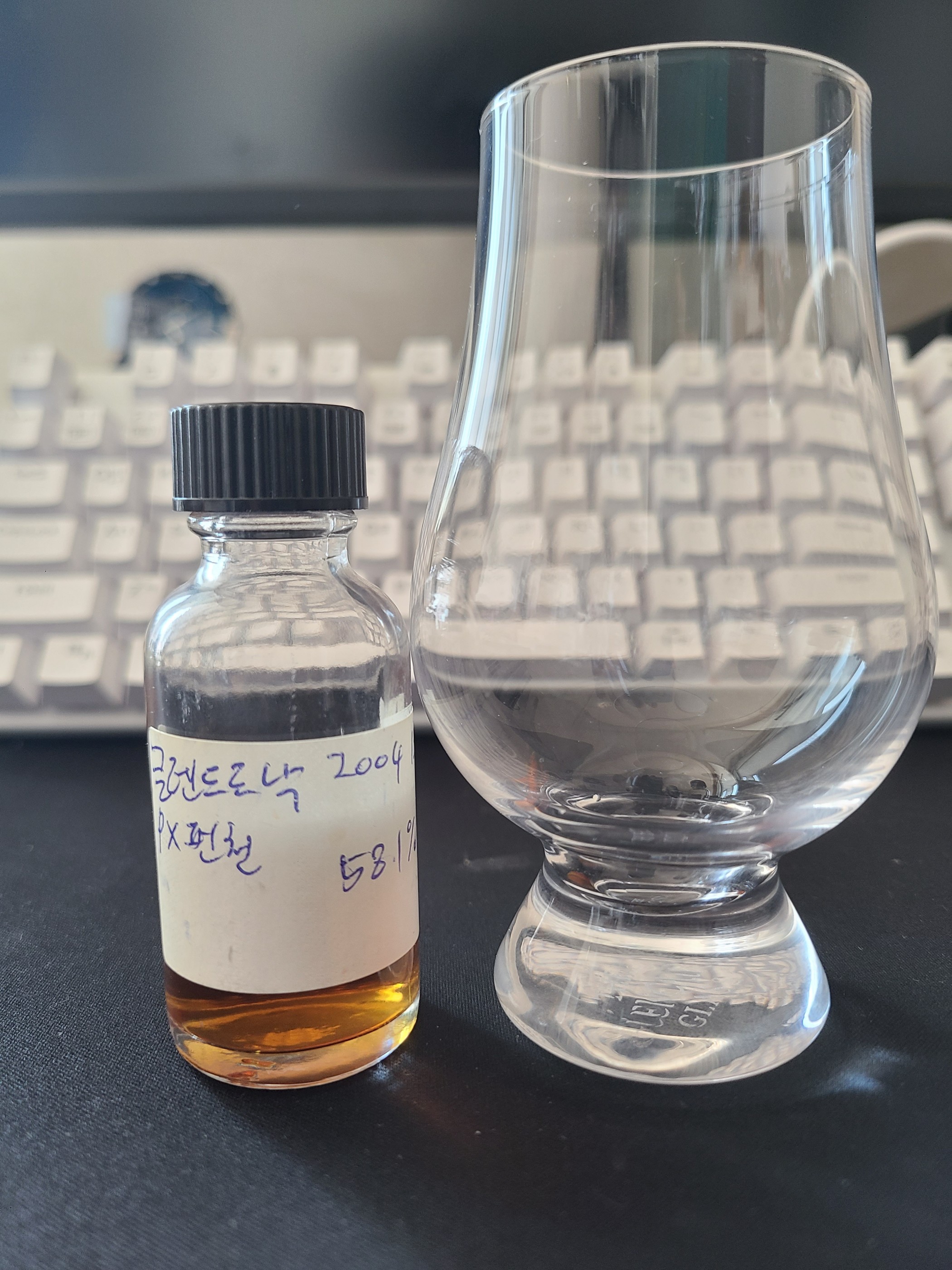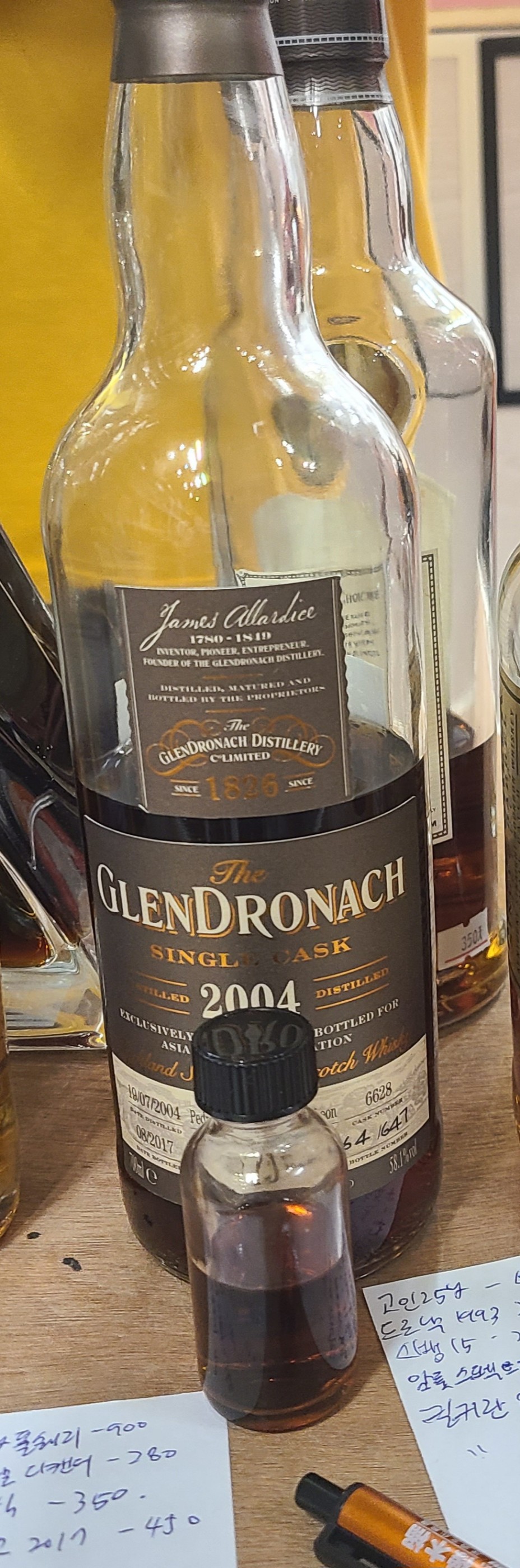 종류 : 싱글몰트 위스키 도수 : 58.1% 19/07/2004 캐스크 넘버 : 6628 N - 베리, 건포도. 커피, 초콜릿, 나무 왁스같은 질감과 레그가 꽤 끈적거린다. 과일의 시트러스와 가벼운 오크가 올라온다. 붉은 베리류와 건포도의 과일 같은 향이다. 약간은 커피, 다크 초콜릿의 쌉싸름함과 흙 혹은 나무의 향도 함께난다. 전체적으로 꿉꿉한 느낌은 전혀 없고 드로낙인지 모르고 마시면 드로낙 같지 않은 느낌이다. 향 자체는 미묘한 느낌이 많이 든다. P - 베리, 드라이한 와인, 시트러스, 바닐라 신 맛과 단 맛이 강렬하게 온다. 레드 베리와 블루 베리, 이 두개의 산미가 복합적으로 느껴진다. 꽤 산미가 강하게 나고 과일 느낌이 풍성하다. 산미 뒤에 약간의 단 맛이 느껴지고 와인도 함께 지나간다. 뒷 부분에서 바닐라와 꿀의 느낌이 들면서 다시 산미가 올라온다. F - 베리, 나무 꽤 길게 시트러스와 나무, 부드러운 피니쉬로 마무리된다.