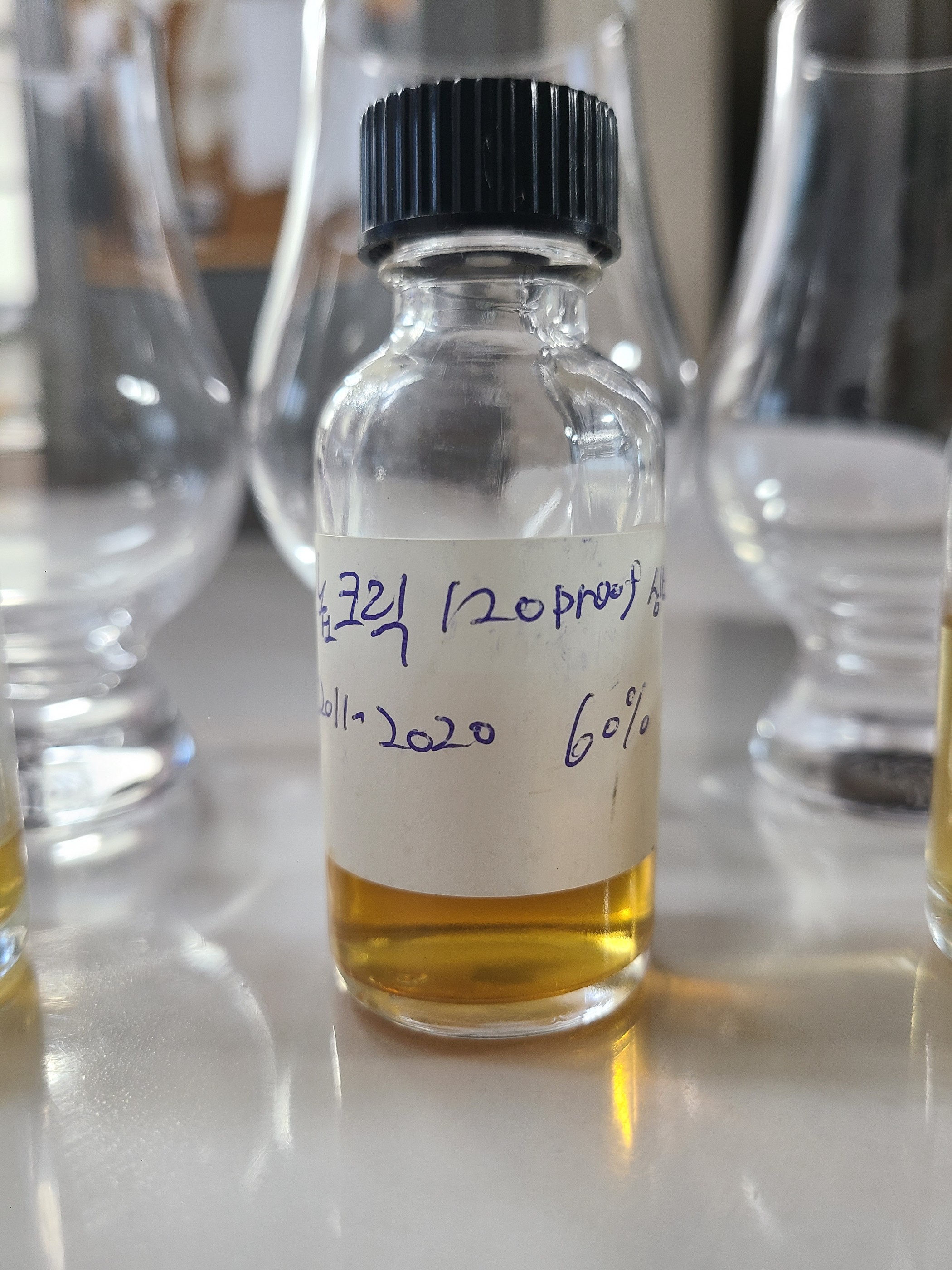 종류 : 버번 도수 : 60% N - 건과류, 체리, 카라멜, 가죽, 아세톤 직관적인 체리와 건과류의 향. 그리고 카라멜과 흑설탕의 달달함이 난다. 건과류와 달달함이 공존하는 향이다. 60도 치고 알콜이 그렇게 치지는 않고, 매운 향도 강하지 않음. 맞다보면 약간 가죽 향까지 나면서 좋은 버번이다. P - 땅콩, 꿀, 토피, 베리, 바닐라, 오크 강하게 치는 첫 입. 고소하면서 살짝 풋내 나는 생 땅콩. 그리고 꿀, 토피가 떠오르는 단 맛. 체리가 상대적으로 연하게 느껴지고 붉은 베리류에 더 가까워졌다. 단 맛 다음에 바닐라가 돌아오고 오일리한 질감으로 이어진다. 큰 맛 몇 개가 전체 파이를 전부 잡아 먹고 있다. 끝에서 오크의 쌉싸름과 민트 계열의 화한 느낌이 든다. F - 오크, 베리, 다크 초콜릿 처음에는 오크 같은 쌉싸름이 있다가 살짝의 단 맛과 신 맛을 지나 초콜릿의 쌉싸름으로 변한다.
