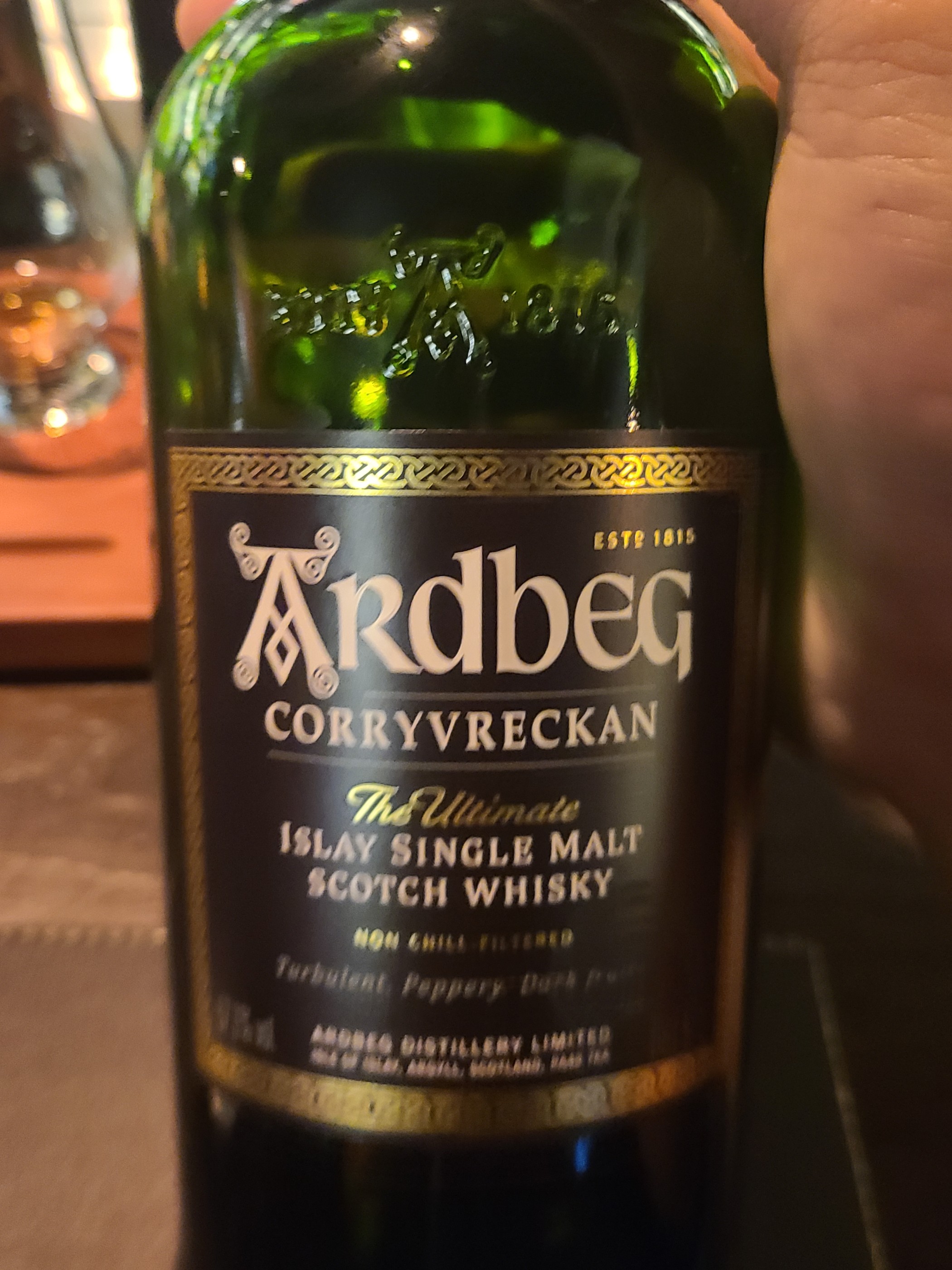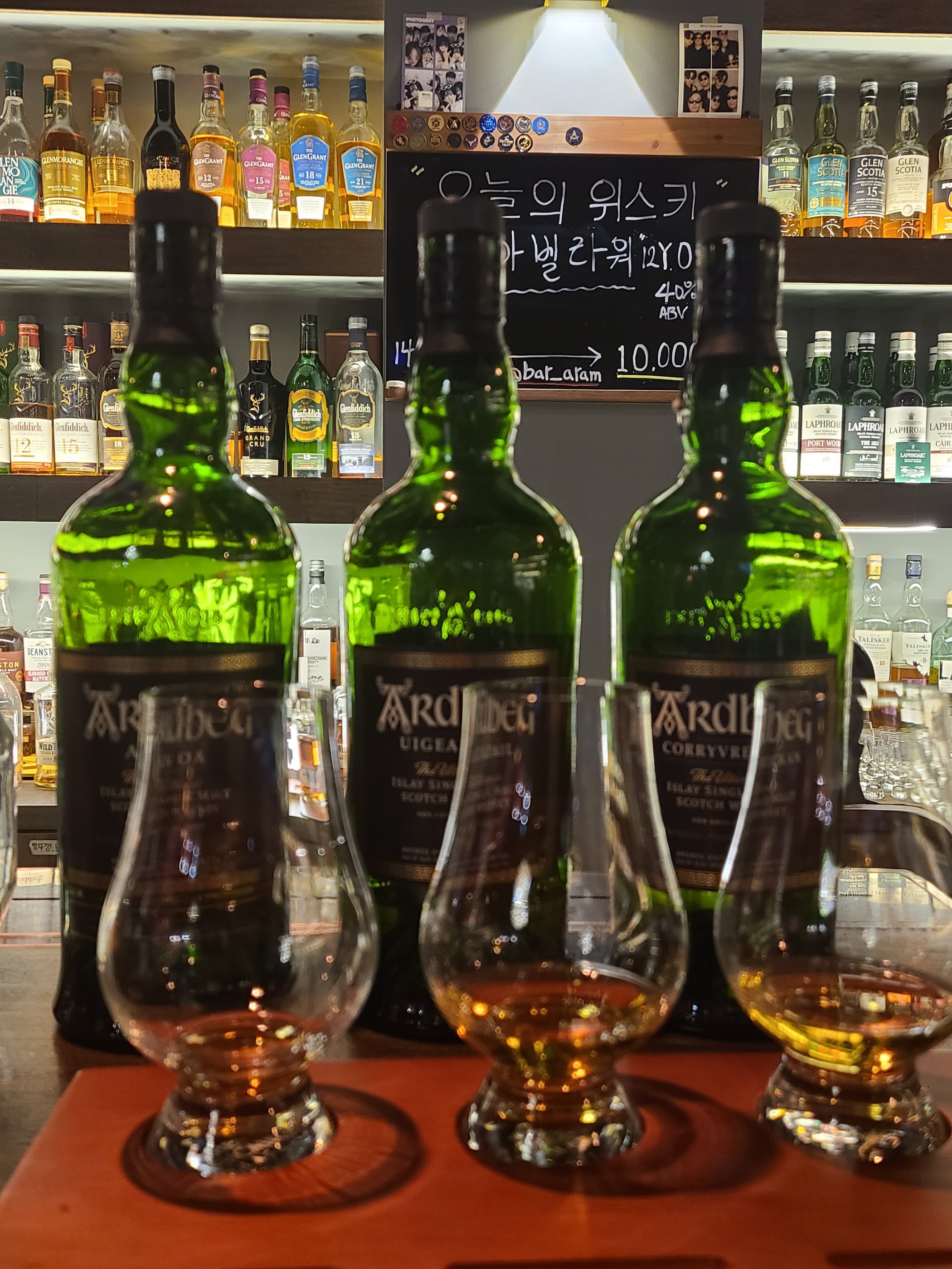 종류 : 싱글몰트 위스키 도수 : 57.1% N - 스모키, 청사과, 꽃, 복숭아, 밀크 초콜릿 스모키가 오늘 마신 아드벡 중 가장 강력하다. 다른 아드벡은 건과일 같은 찐득한 느낌이 었다면 코리브레칸은 청사과 같은 화사한 느낌이 있다. 꽃 향도 약간 있으면서 복숭아 같아 같은 단 향이다. 스모키함이 강한데, 과일들이 있으니 구운 과일 같다. 밀크 초콜릿 같이 쌉싸름하면서 부드러운 향도 끝에서 나면서 바닐라 같은 뉘앙스도 보여준다. P - 구운 사과, 베리, 꿀, 피트, 바닐라, 스파이시, 훈제 베이컨 찐한 스모키! 구운 사과와 약간의 베리의 프루티함. 꿀 같이 달달한 느낌이 있으면서 피트 감칠맛이 팡 터진다. 확실히 도수가 있어서 그런지 맛들이 꽉 차있고 바디감도 만족스럽다. 바닐라의 부드러움과 오렌지의 시트러스도 느껴진다. 끝 가서 스파이시함 살짝 올라오고 훈제 베이컨이 이어진다. F - 훈제 요리, 후추, 구운 사과