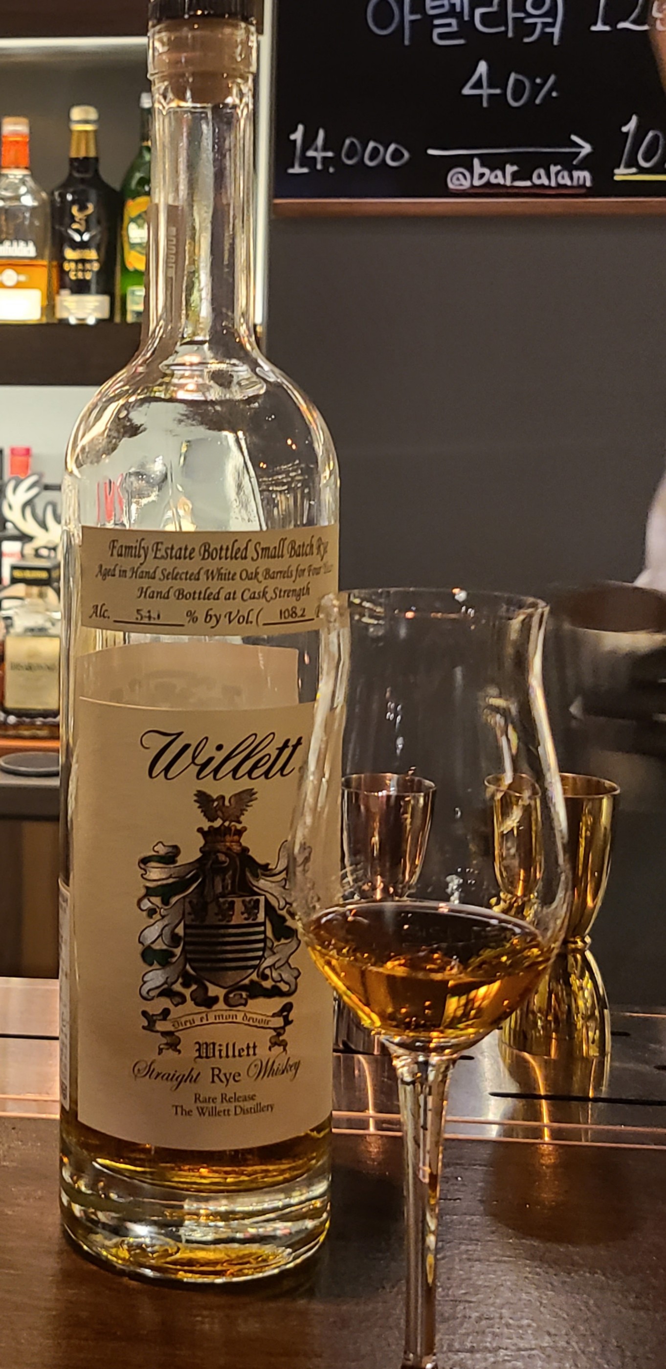 윌렛 라이 종류 : 라이 위스키 도수 : 54.1% (솔직히 말해 이날 윌렛 마시다가 아드벡 유레카 갑자기 넘어가 마셔서 노트가 자세하진 않다) N -허브, 라이, 꽃, 오렌지, 토피, 체리, 건초. 헤이즐넛, 가죽, 시나몬 잭 라이 마시고 직후로 마셨더니 허브의 민티함이 더 살아난다 개인적으로 잘 만든 라이는 풀 향도 있지만 꽃 향에 가깝다고 느낀다. 토피 같은 뉘앙스의 단 향도 있으면서 흑설탕 같은 단내도 있다. 오렌지, 체리 같은 시트러스가 있고 건초에 가까운 향이 난다. 화사한 향에 정향의 매움이 톡톡 있고 헤이즈넛 같이 고소하면서 부드럽다. 조금 더 향을 맡아보니 가죽과 시나몬 핵과도 살짝 보인다. 내가 기억하고 윌렛 라이 향보다 더 좋다고 느꼈다. 윌렛 라이 56 몇도 짜리 마셔보고 이놈도 도수가 중요하구나, 생각했었는데 의외로 아니였다. 물론 다른 날에는 또 모르겠지만 이 글을 쓴 순간에는 이쪽이 더 괜찮았다. P - 체리, 오렌지, 사과, 핵과류, 흑설탕, 바닐라, 건과류, 계피, 라이 전에는 이 정도로 과일을 못 봤던 것, 같은데 과일이 많이 보인다. 가장 먼저 체리, 오렌지, 사과, 약간의 자두의 과일. 맛에서도 흑설탕, 카라멜, 바닐라가 잘 보이는게 정말 맛있다. 계피의 매움도 있지만 과일이 많아서인지 너무 잘 어울리고 건과류의 고소함이 따라온다. 끝에 가서 라이가 확 살아난다. 윌렛은 고도수 버번처럼 강한 펀치감이라고 생각했는데, 이놈은 그렇지 않았다. 밸런스 잘 잡혀있고 처음부터 끝까지 좋은 맛들 뿐이었다. F - 바닐라, 카라멜, 허브, 풀 이날 아드벡만 안 마셨으면 더 마셨을 것 같다.