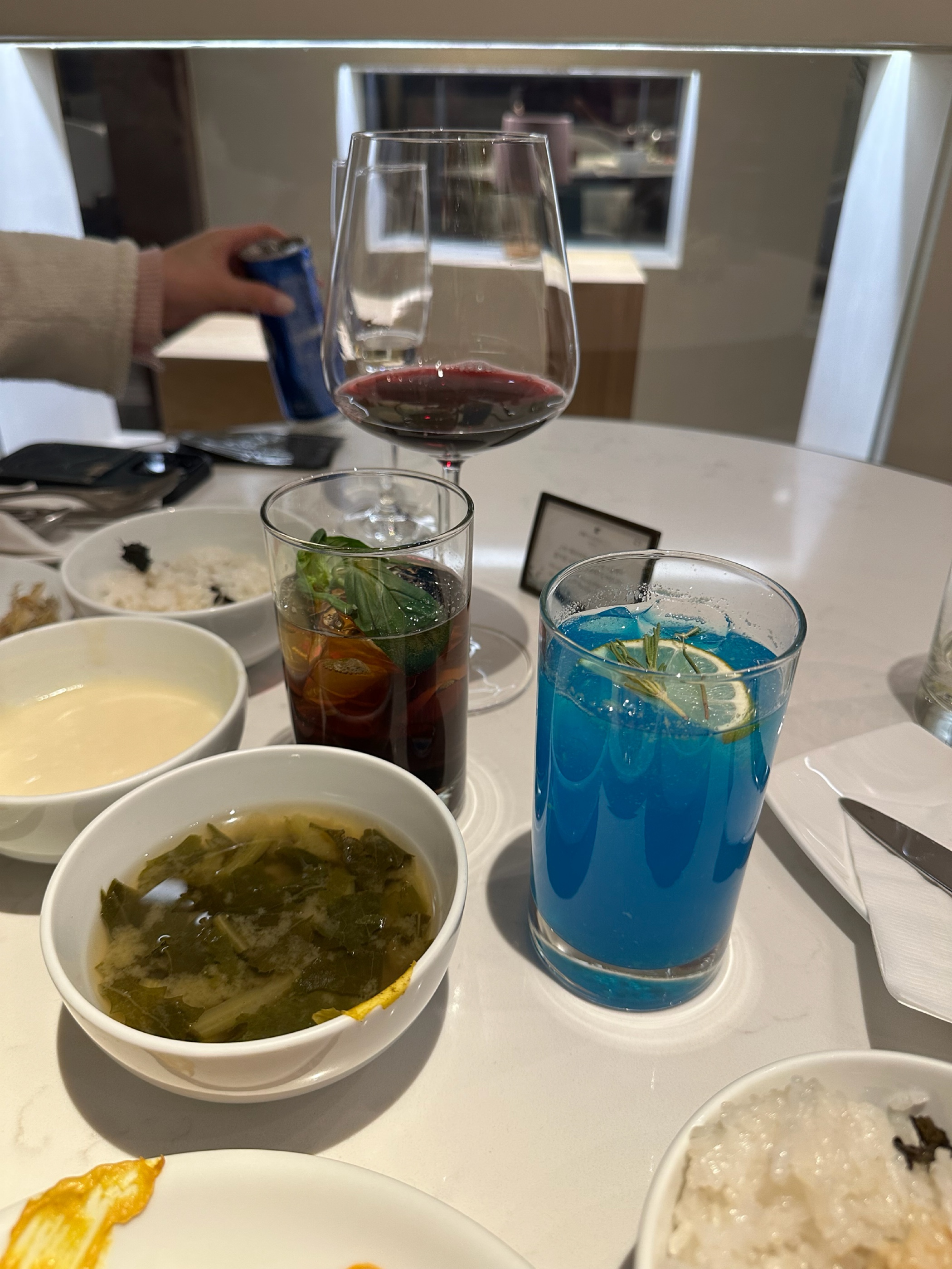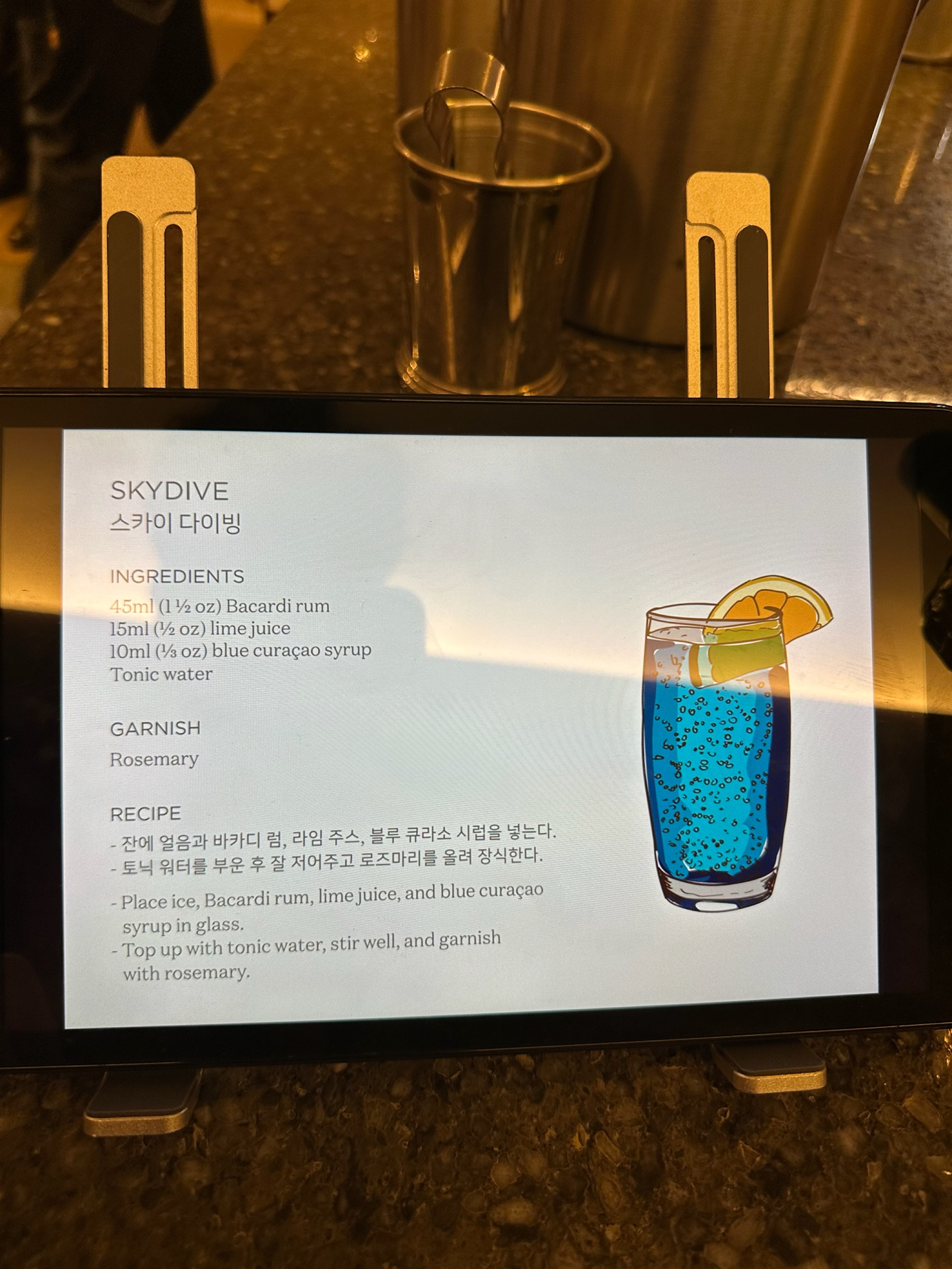 이번에 JW 매리어트 서울 이그제큐티브 라운지를 이용하게 되었습니다. 예전엔 바텐더가 직접 칵테일을 제조해줬는데 코로나 이후로 셀프메이딩 스타일로 바뀌었거군요. 종류도 적어지고 좀 아쉽습니다. ㅠㅠ 바카디 럼 자체는 다들 아시는 맛일테니 이곳에서 제공하는 레시피로 만든 ‘스카이 다이빙’이라는 칵테일이 굉장히 맛이 좋았습니다. 🍹스카이 다이빙 바카디 럼 45ml 라임 주스 15ml 블루 큐라소 10ml 토닉워터로 채워주고 로즈마리와 라임으로 가니쉬 이거 정말 맛있습니다. 색에서 보이는 대로 파란 약간은 파워에이드 당분 강화 버전 같은 맛으로 시원하고 달콤한 칵테일이었습니다. 강력 추천드립니다 ㅎㅎ