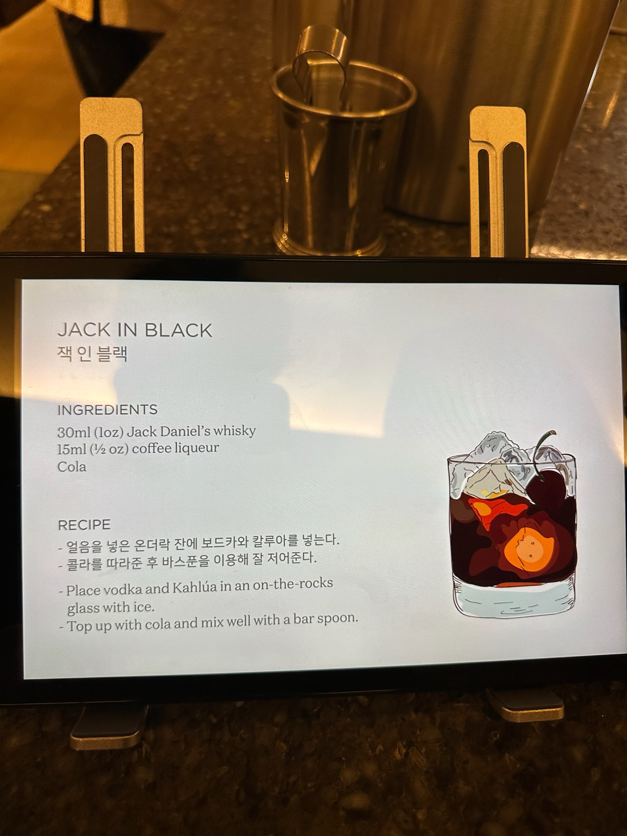 요즘 관세로 말 많은 테네시 위스키 잭 다니엘스 입니다. 잭 다니엘스 자체는 국밥 그 자체이니 설명이 따로 필요 없겠죠. 부드럽고 달콤한 바닐라와 커피, 그리고 토피넛이 느껴집니다. 이번 칵테일은 잭콕이 너무 뻔하다 하실 때 딱 하나만 더 추가해서 먹기 좋은 ‘잭 인 블랙’입니다. 🍹잭 인 블랙 잭 다니엘스 30ml 커피 리큐르 15ml 콜라로 가득 필 사실 깔루아 같은 커피 리큐르로 만들어야 하는데 다 떨어져서 에스프레소로 만들어 보았습니다. 술도 많이 마시고 커피까지 마시니 심장이 두근거리더군요… 맛은 잭콕에 씁쓸한 커피를 탄 맛, 꽤나 맛있었습니다. 당도는 콜라로 마셔가며 조절해도 좋을 것 같습니다. 밤에 에너지 드링크 대용으로 마시고 싶을 때 추천드립니다. ㅋㅋㅋㅋ