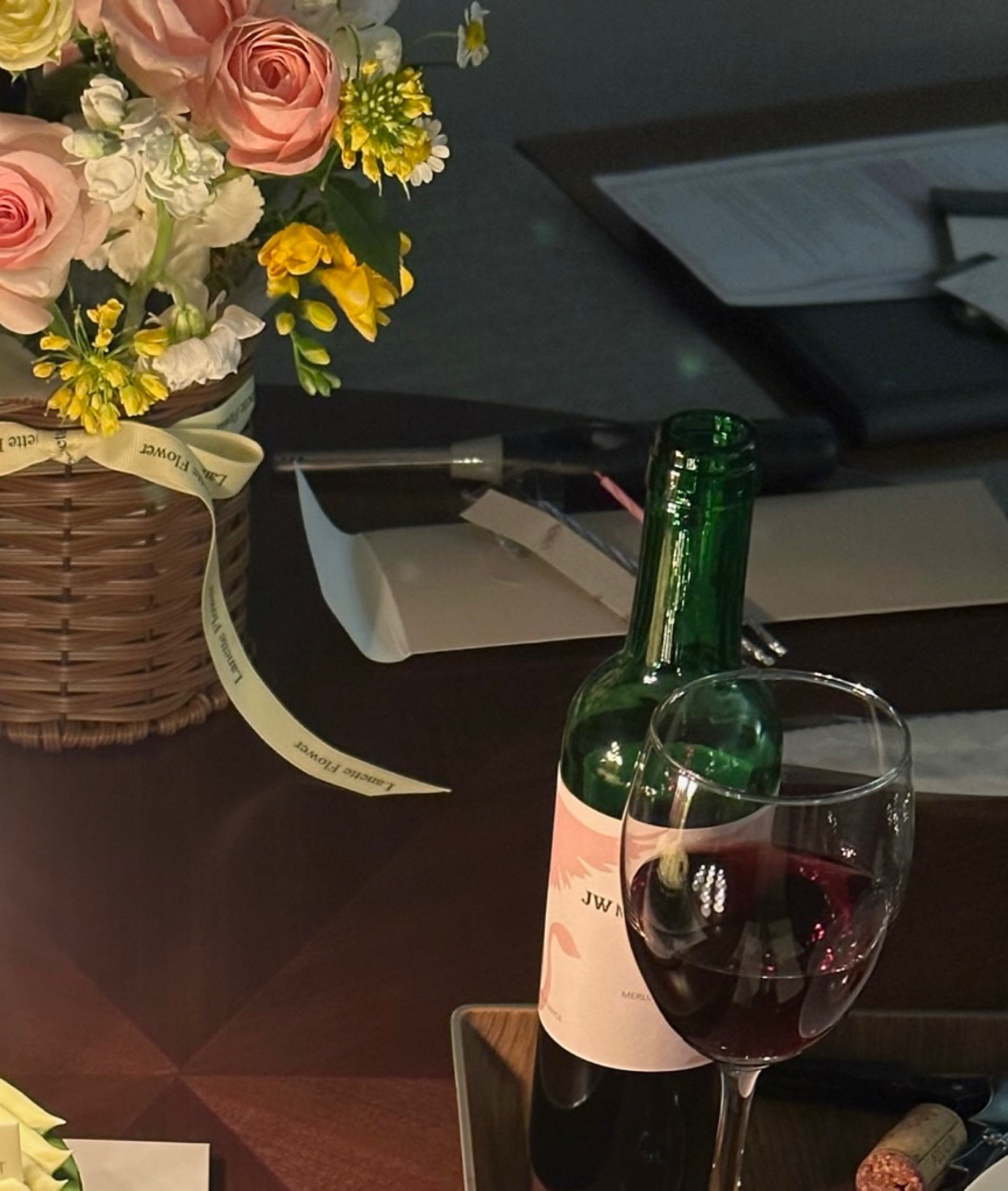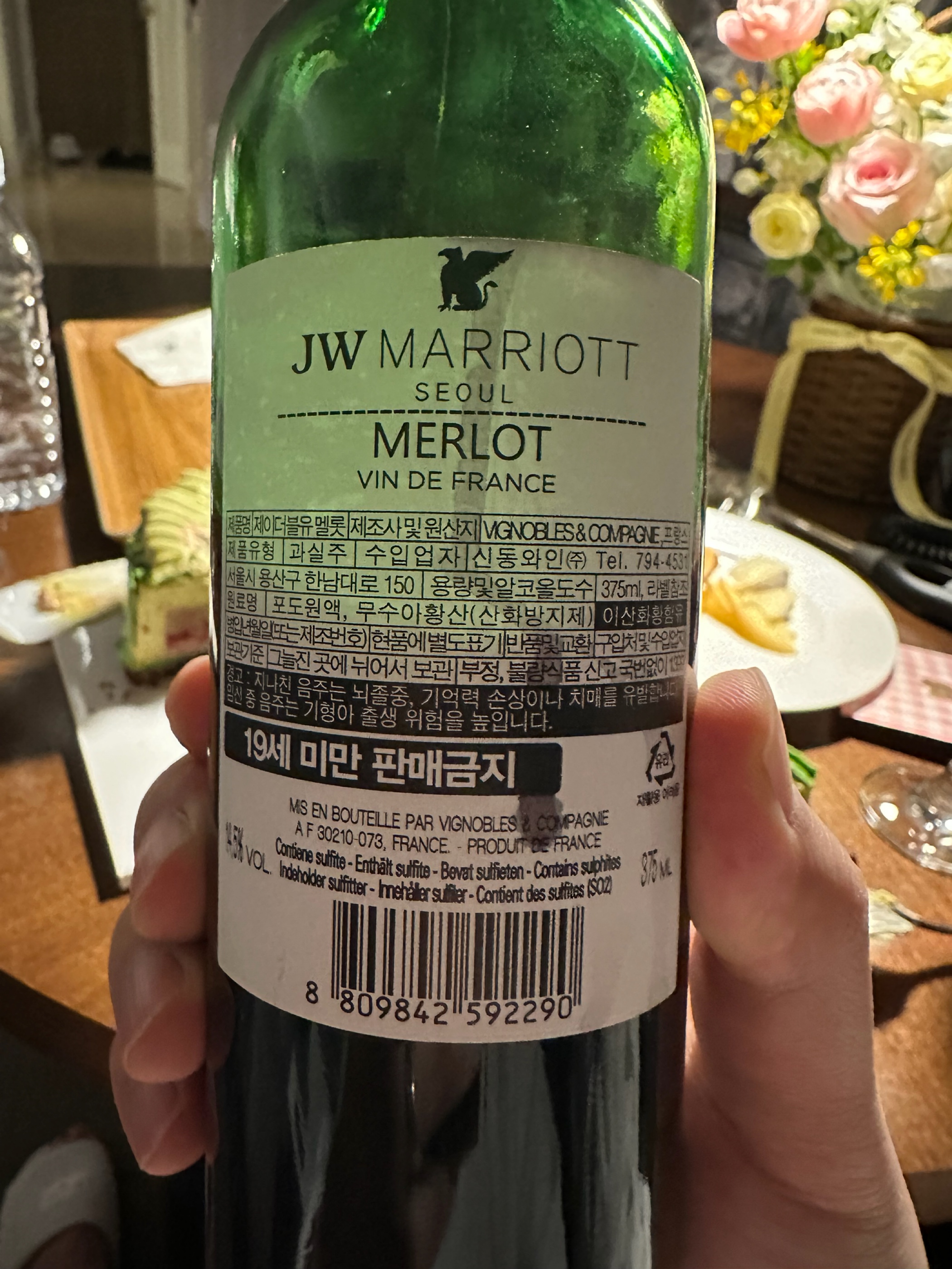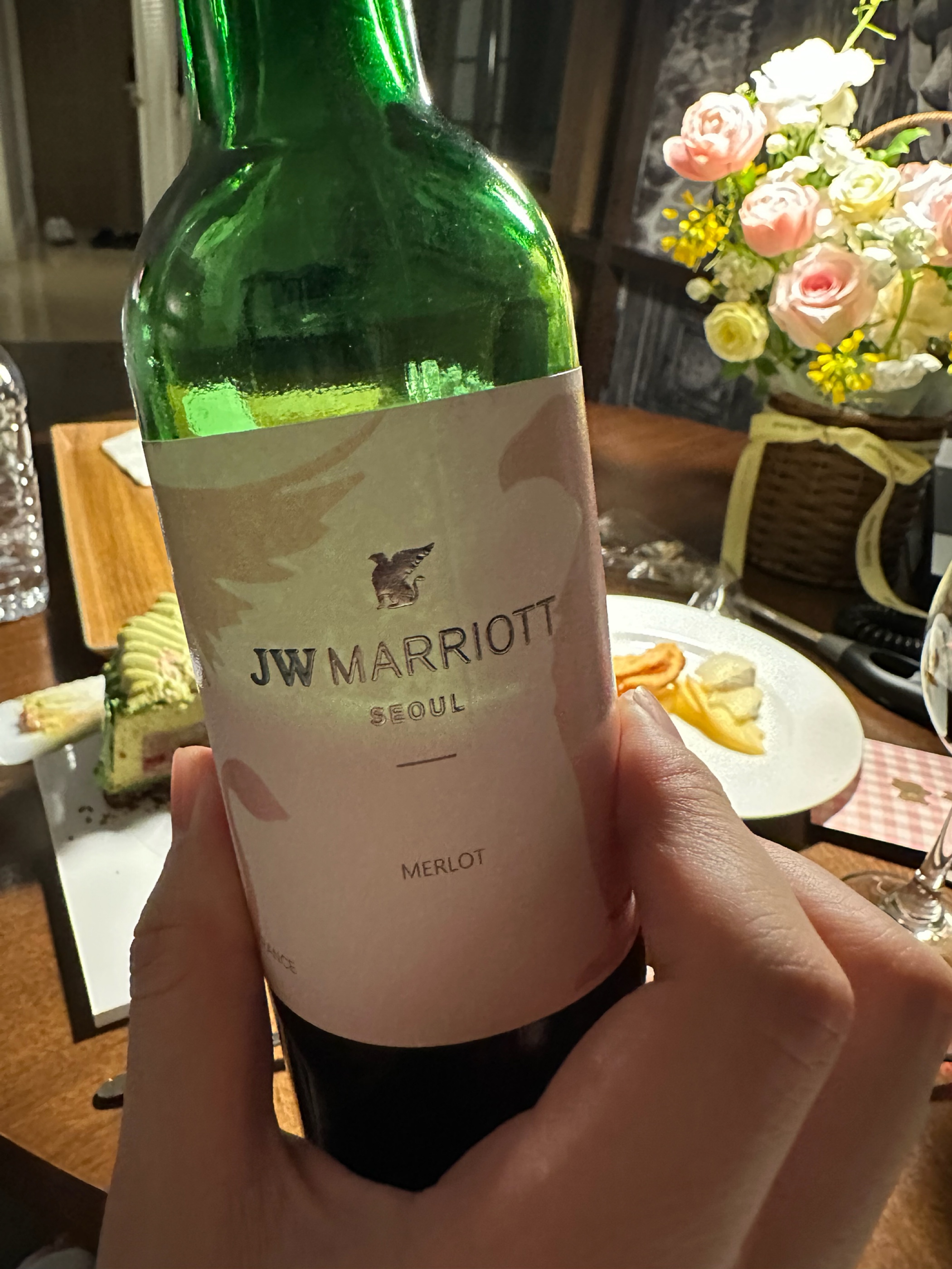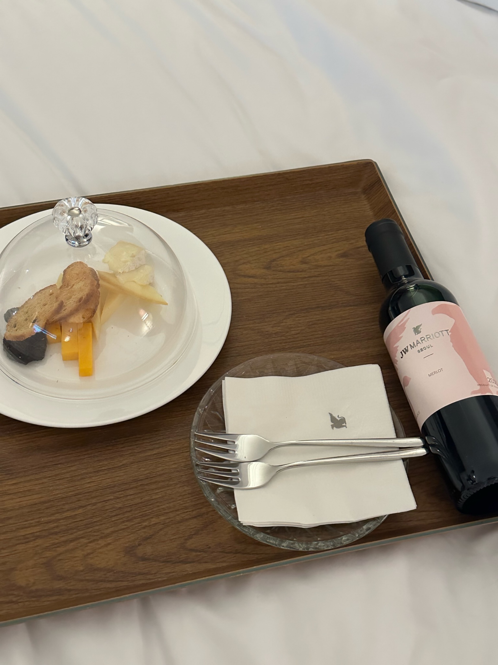 호캉스 중에 여자친구 생일이라고 호텔에서 따로 챙겨준 JW 메리어트 기념일 와인입니다! 와인 이름이 제이더블유멜롯이네요. 프랑스 와인인가 봅니다 ㅎㅎ 즐거운 기념일이 되라고 준비한 와인이라 그런지 라운지에서 마셨던 와인보다 훨씬 저희 취향에 맞았습니다! 적당히 쥬시하고 포도나 베리류의 향도 느껴지니 너무 맛있었습니다! 맛과 향, 도수까지 즐거운 기념일을 즐기기에 뭐하나 빠짐없는 최고의 한병이었네요. 함께 준비해준 치즈도 너무 좋았습니다!
