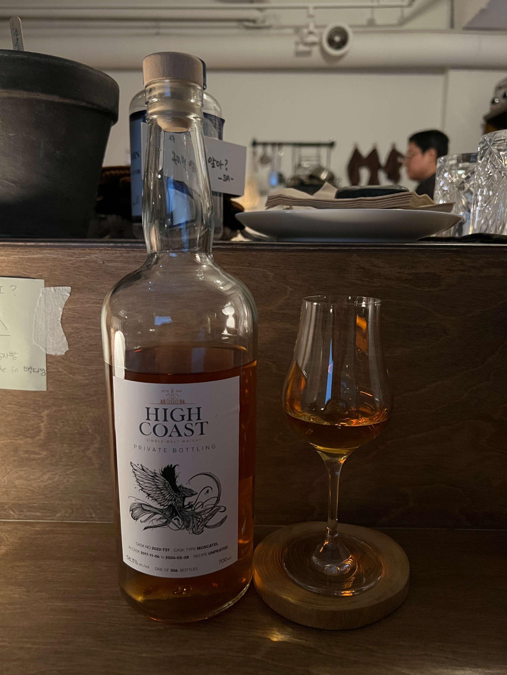 하이코스트 프라이빗캐스크 #3 모스카텔 살짝 건베리향과 달콤한 향이 같이 느껴짐. 살짝 초코릿향도 잡힘. 말린 베리맛과 밀크 초코릿맛이 느껴지고 스파이시가 강하게 느껴짐. 피니쉬는 맛과 유사한 잔향으로 길게 느껴짐.